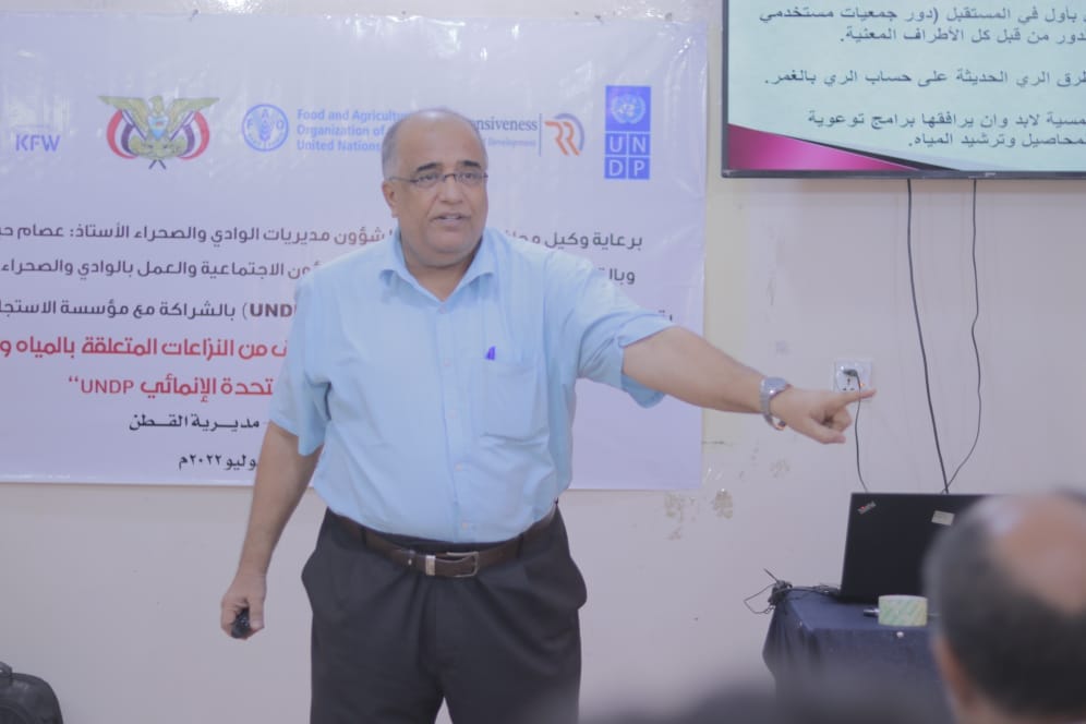 تم التعرف على أهداف الورشة من خلال التحقق من النزاعات المتعلقة بالمياه التي وردت في تقرير ال UNDP في كل من شبام والقطن ومقارنتها بالتدخلات لحل النزاعات والتي وردت في تقرير FAO و توثيقها وحلها تحت مبدأ ” لا ضرر ولا ضرار ” Do No Harm ومن ضمنها نزاعات الورثة و النزاع على ملكية الأرض و تفتت الحيازات الزراعية و نزاعات نظام الري بالآبار ونزاعات الري السيلي ( السيل) والاتفاق على آلية لحل هذه النزاعات و التدخلات بين كل الأطراف ذات العلاقة والتي ستنفذ بعد عيد الاضحى
